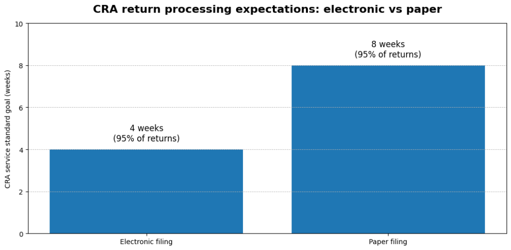 CRA notes they aim to process 95 percent of electronically filed returns within four weeks and paper returns within eight weeks, though some may take longer if selected for review.