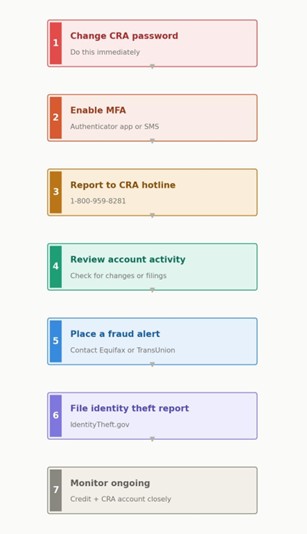 If you suspect the account has been compromised, do not wait for certainty. The CRA’s page on reporting a scam or identity theft says suspicious activity should be reported, even where the full facts are still being worked out. Waiting too long often makes the cleanup harder.