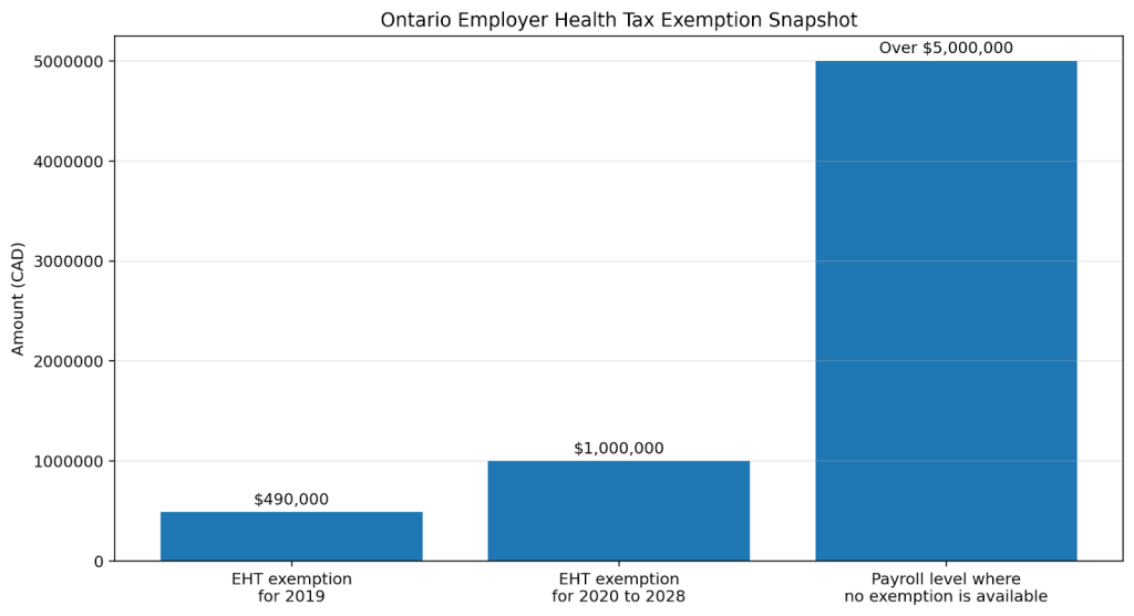 - Employer Health Tax (EHT) applies beyond certain payroll thresholds