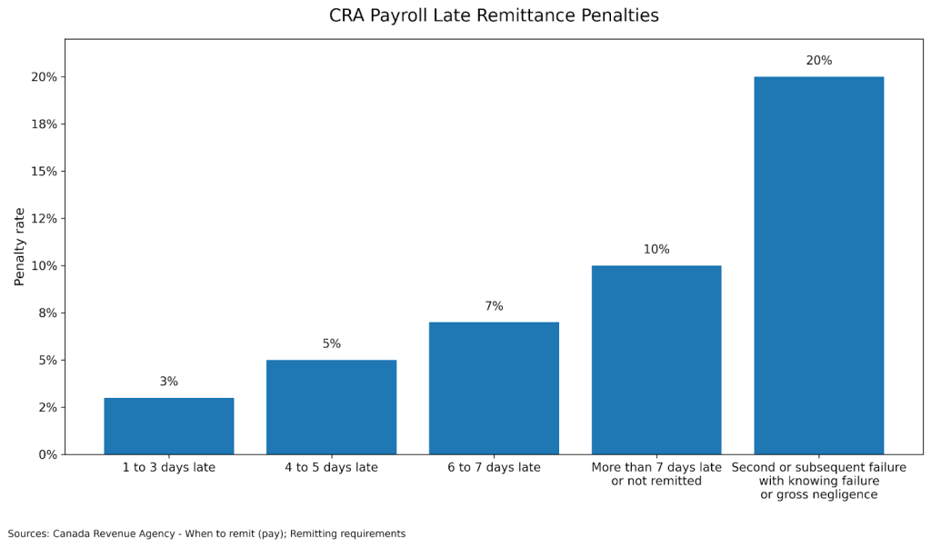 Late remittances can become expensive quickly. CRA applies graduated penalties for late payroll remittances, and repeated failures or gross negligence can increase the penalty further.