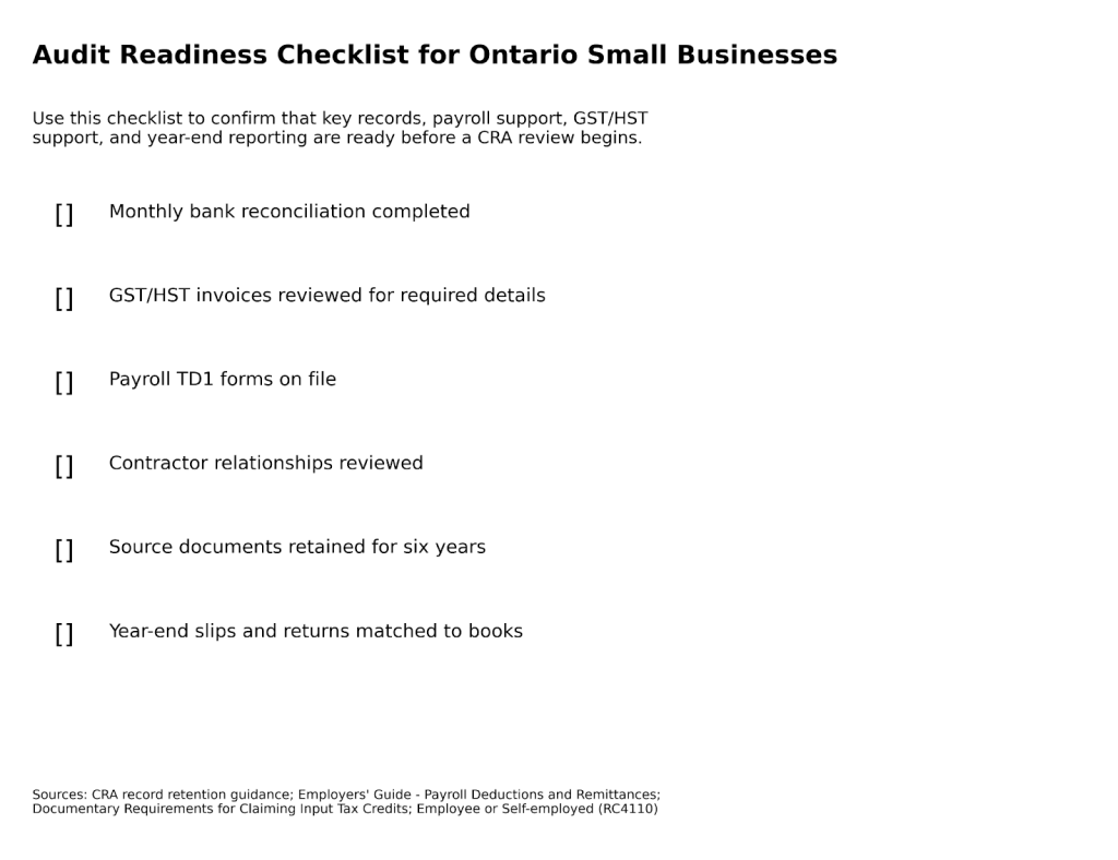 The practical takeaway is simple: audit readiness is not a one-time project. It is a recordkeeping and reconciliation discipline. Businesses that keep clean files, separate personal and business activity, and fix errors early are usually in a stronger position if CRA asks questions.