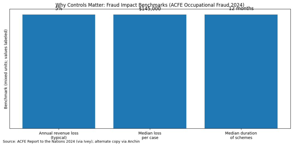 Direct Answer: Controls do not just prevent penalties. They protect revenue. The ACFE’s 2024 Report to the Nations notes a long-running benchmark that organizations lose about 5% of revenue to fraud, and reports a median loss of $145,000 with a median duration of 12 months.
