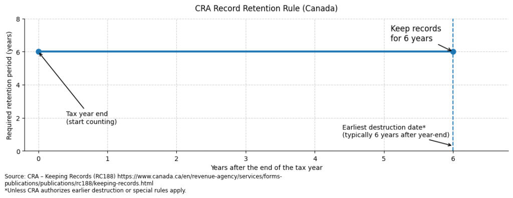 Even if you are not thinking about audit, CRA expects adequate records. CRA guidance states that, generally, you must keep required records and supporting documents for six years from the end of the last tax year they relate to, unless CRA allows earlier destruction.