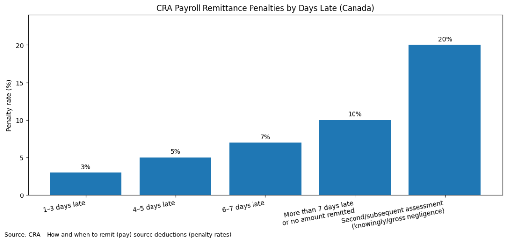 Controls reduce penalties by preventing late remittances and documentation gaps. CRA outlines escalating penalties based on how late a remittance is, including higher penalties in repeat or gross negligence situations. A payroll calendar, backup approver, and proof-of-payment filing are simple controls that protect you.