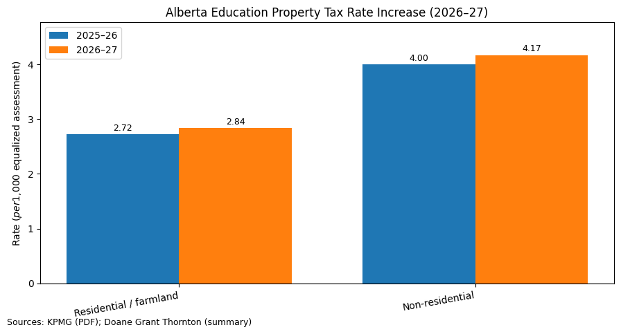 Budget 2026 increases Alberta education property tax rates for 2026 to 2027 to $2.84 per $1,000 of equalized assessment for residential and farmland properties and $4.17 per $1,000 for non residential properties. Even if you do not own property, leases often pass property tax through to tenants, so your rent or CAM charges may rise.