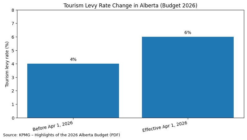 The tourism levy rate increases from 4% to 6% effective April 1, 2026. The levy applies to the price of short term accommodation in Alberta.