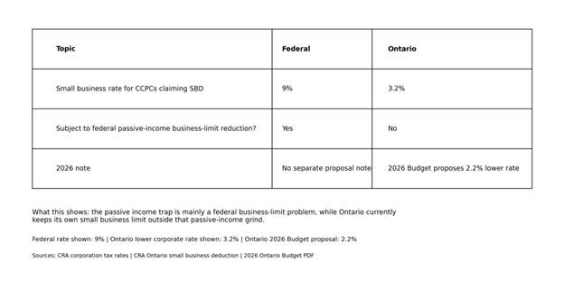 There is also a current Ontario planning wrinkle. The 2026 Ontario Budget says the government is proposing to cut the small business corporate income tax rate from 3.2% to 2.2% effective July 1, 2026. As of the current CRA Ontario page, the enacted lower Ontario rate remains 3.2%, so owners should treat the 2.2% rate as a proposal until it is actually enacted.