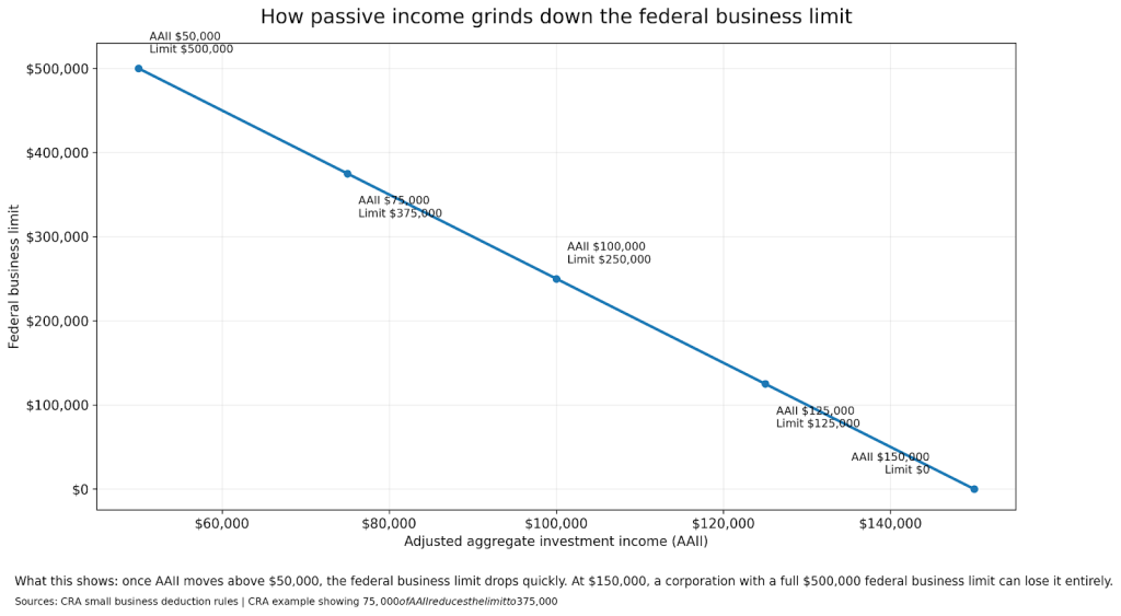 For many Ontario corporations, Passive Income is not just a side tax issue. It can reduce access to the lower federal small business rate on active business income. Under CRA’s small business deduction rules, the federal business limit starts grinding down when adjusted aggregate investment income, or AAII, goes above $50,000 in the prior calendar year. If AAII reaches $150,000 and the corporation otherwise has the full $500,000 business limit, the federal limit can be reduced to nil. Ontario adds an important twist: CRA says the Ontario small business deduction is not subject to the federal passive-income business-limit reduction.