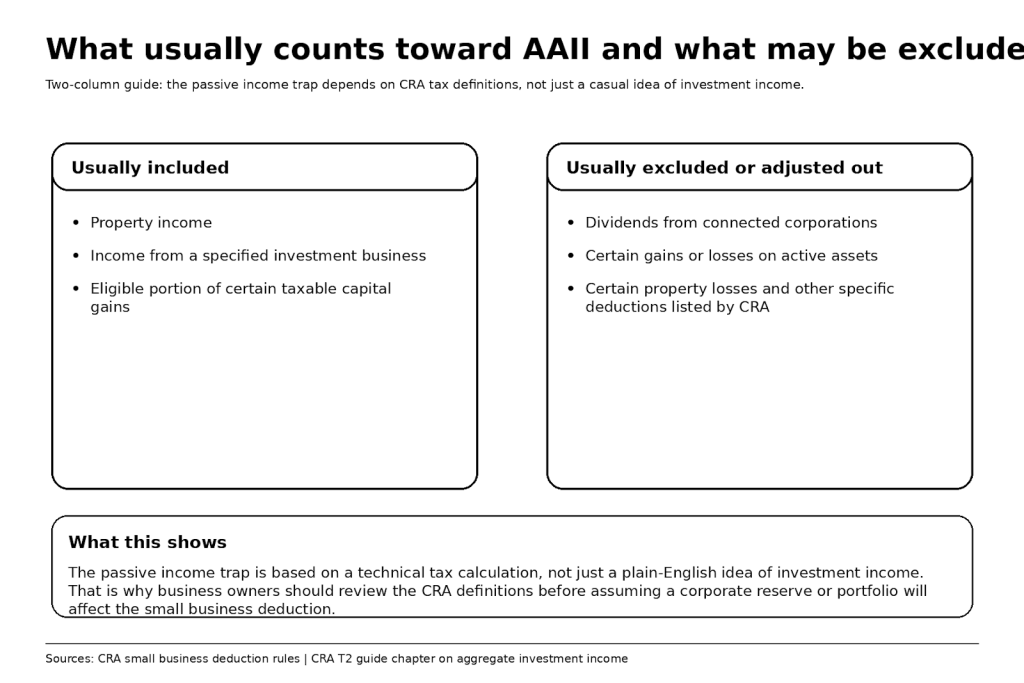 The passive income trap is the rule that cuts a CCPC’s federal business limit when adjusted aggregate investment income becomes too high. CRA’s small business deduction rules page explains that a CCPC’s business limit is generally $500,000, subject to the normal associated-corporation and taxable-capital rules, and that it is further reduced on a straight-line basis if the total AAII of the corporation and associated corporations is between $50,000 and $150,000. CRA gives the formula as BL / $500,000 × 5 × (AAII − $50,000).