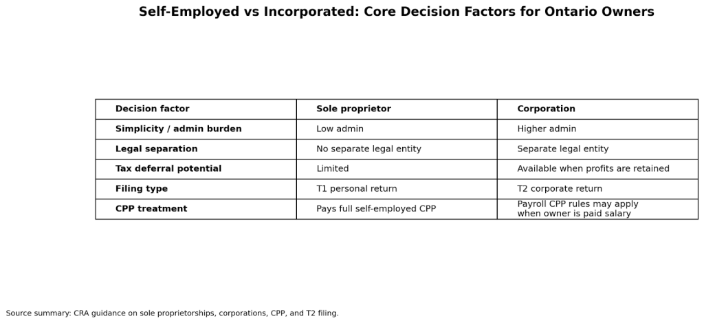 Incorporation often becomes more attractive when you are earning more than you need personally, can leave some after-tax profit in the business, want a structure that separates the company from you personally, or expect the business to grow beyond a one-person operation. It also becomes more practical when contracts, lenders, or future partners prefer dealing with a corporation. CRA’s setup guidance identifies corporation as a distinct business structure, and Ontario’s online services confirm that incorporating and maintaining a corporation is handled through the Ontario Business Registry and related provincial filings.