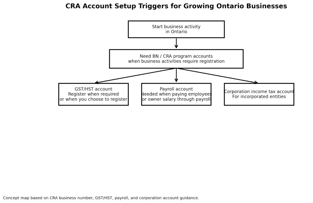 For Ontario business owners in 2026, this is not just a tax decision. It also affects GST/HST registration, payroll setup, how you pay yourself, whether you need a Business Number, and how much compliance work you will carry every year. CRA notes that incorporated businesses need a BN, while unincorporated businesses usually only need one when they register for CRA program accounts such as GST/HST or payroll.