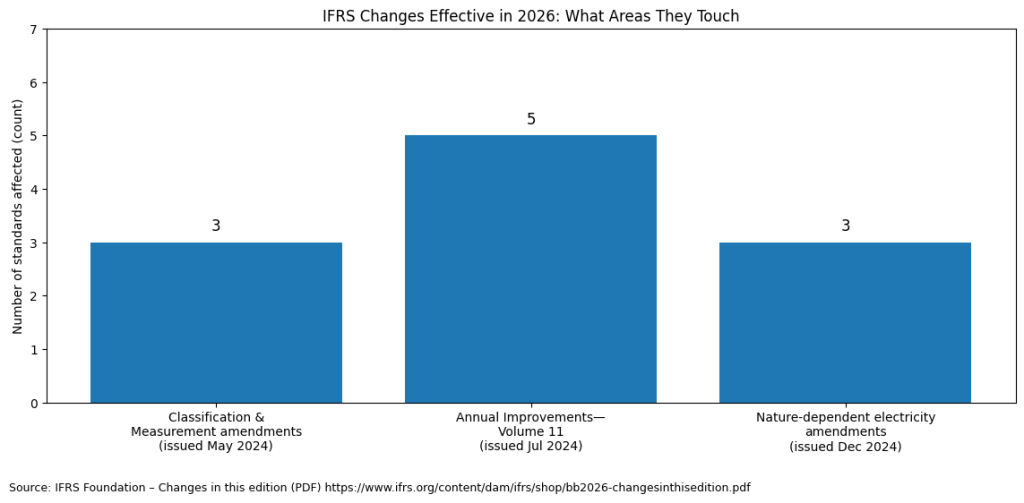 For annual reporting periods beginning on or after January 1, 2026, the IASB’s IFRS changes are concentrated in three areas: