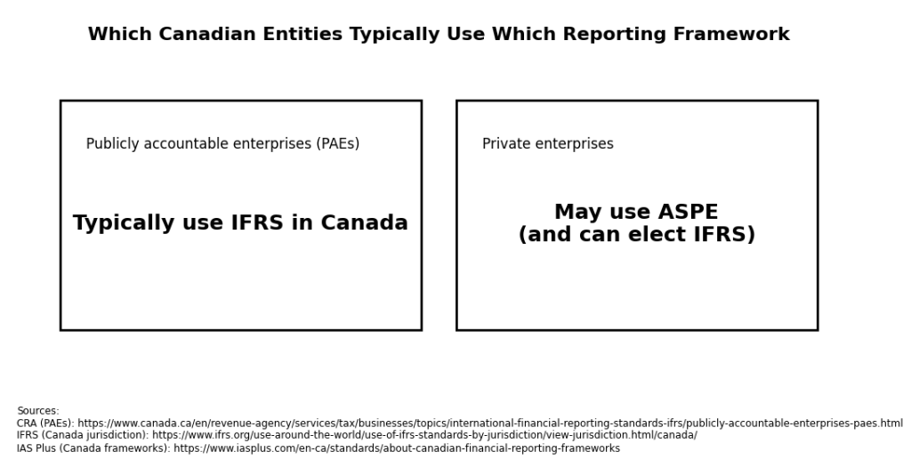 Many private enterprises in Canada can use ASPE. IFRS is required primarily for publicly accountable enterprises, though some private companies elect IFRS for lender, investor, or group reporting needs.